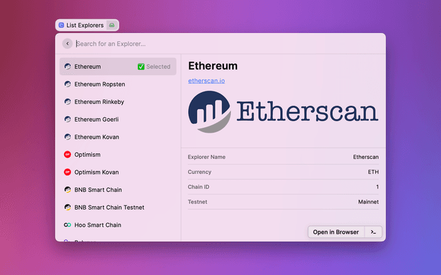 Search and display information found on addresses, transactions, and tokens on blockchain explorers like Etherscan.