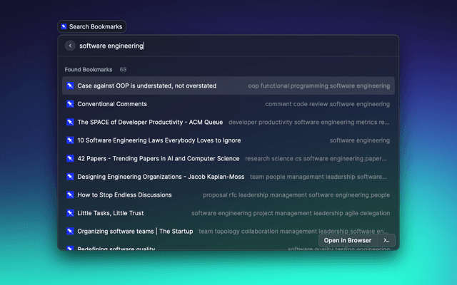 Post new bookmarks to Pinboard and search through your Pinboard bookmarks. Tip: Assign a global shortcut to the "Add Bookmark" command, select a URL, and then run the command ✨
