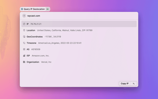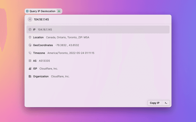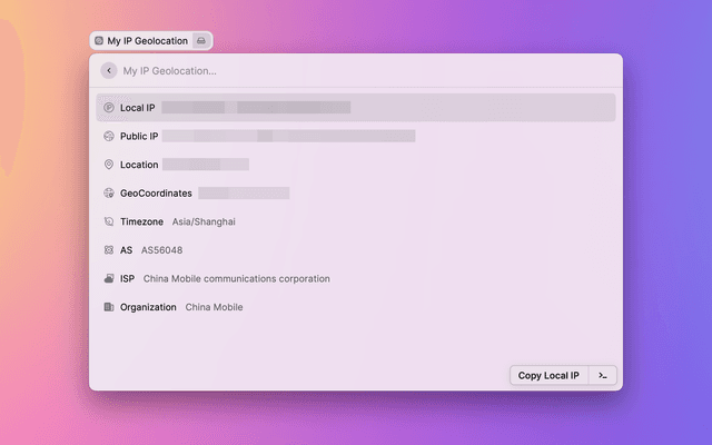 Show local and public IPv4/IPv6 address. Query geolocation for any IP address or domain.