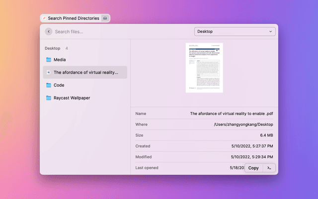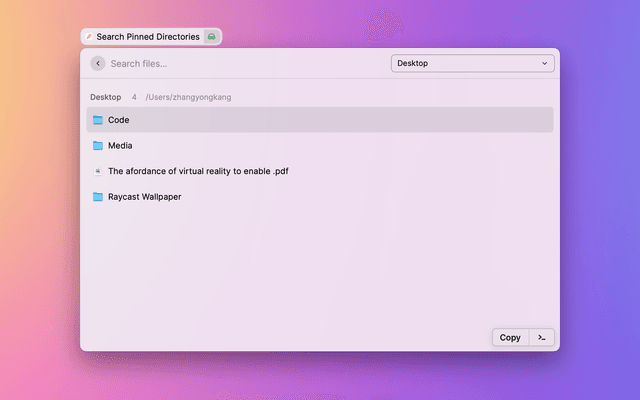 This extension is equivalent to moving a folder to the Dock bar. Previously you had to use the mouse to access the folder in the Dock bar, now you can use Raycast to quickly access the pinned folder.