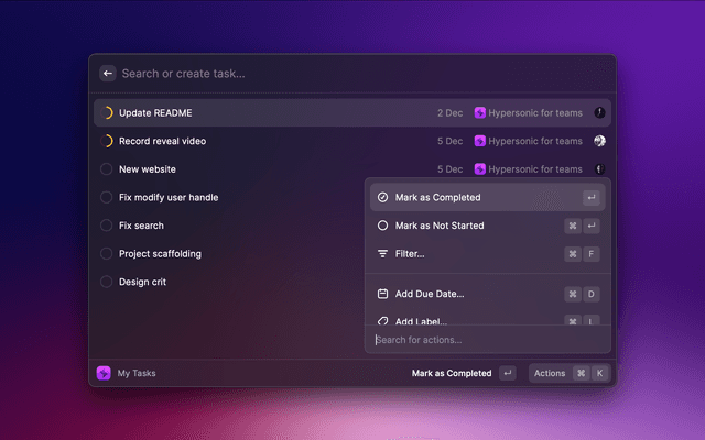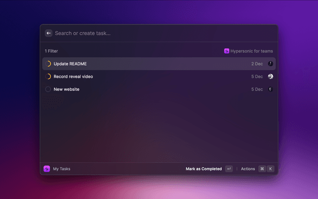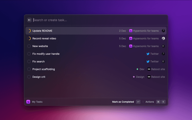You can manage your tasks faster than ever in Hypersonic. We use natural language recognition to separate the task from its metadata, so you just need to type.